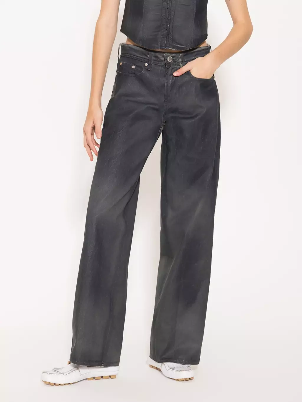 Jeans Lina Coated de fit recto y tiro medio-bajo, con un calce relajado. Está confeccionado en denim 100% algodón, tiene un proceso de coating simil cuero en tono azulado aplicado sobre base cruda, que genera un efecto visual único. Los desgastes estratégicos dejan ver la base natural, aportando textura y contraste a la prenda.