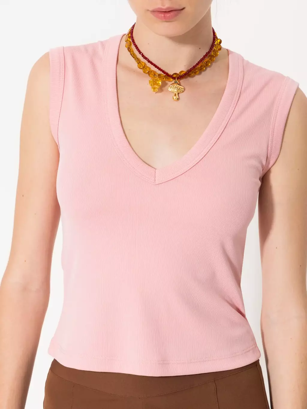 Musculosa Muni confeccionada en tela de punto tipo morley. De escote en V cavado y su es calce al cuerpo.