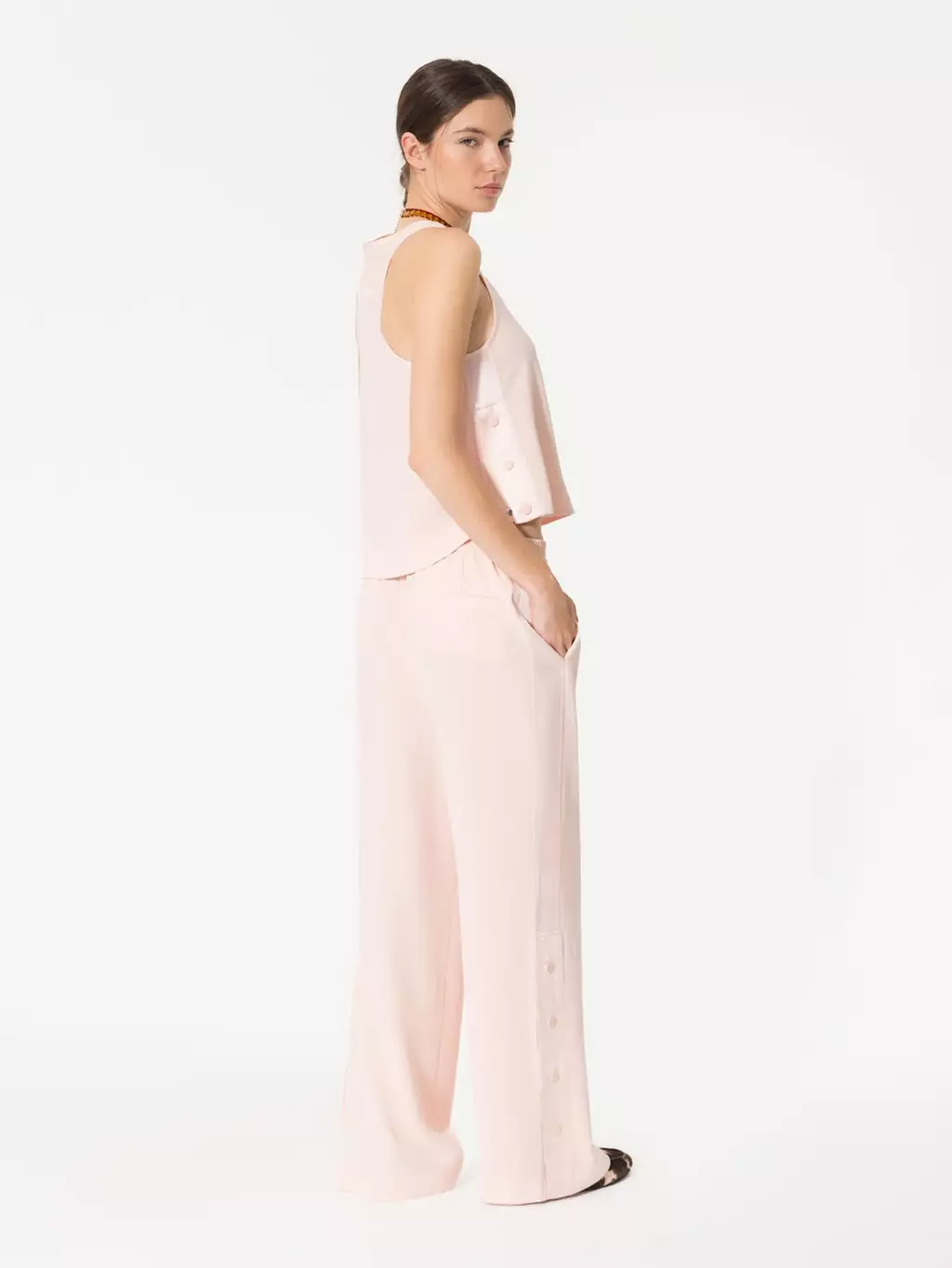 Pantalón Cairo de pata ancha confeccionado en satén doble. Lleva cintura elastizada con elástico embutido. Los laterales están terminados con piezas de tela base y broches al tono con logo JCH grabado.