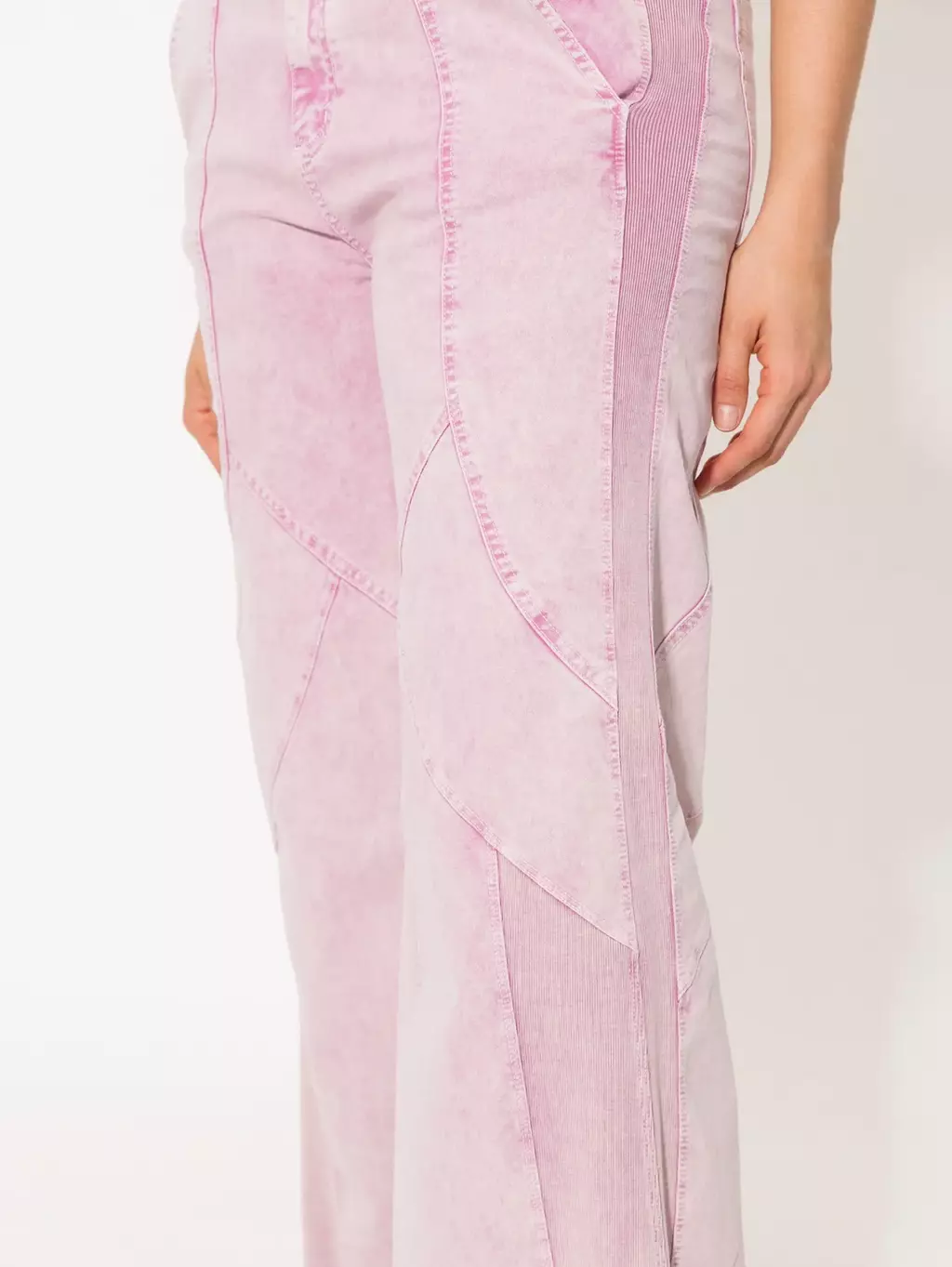Pantalón Carmy wide en combinación de tejidos de plano y punto. Tiene recortes curvos en piernas. Se destacan las costuras mediante el lavado que le otorga textura a la pierna. Lelva bolsillos plaque en espalda y bolsillos diagonales en el frente.