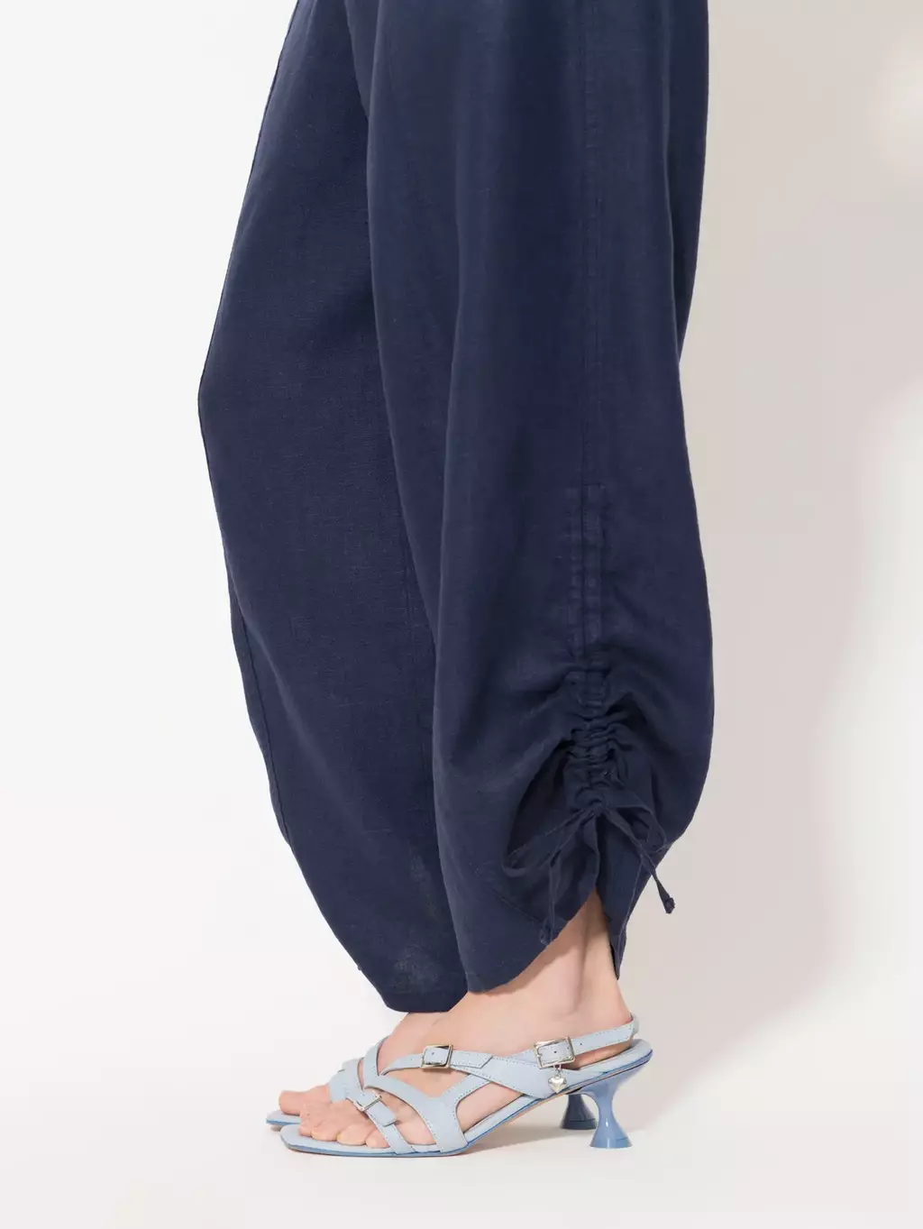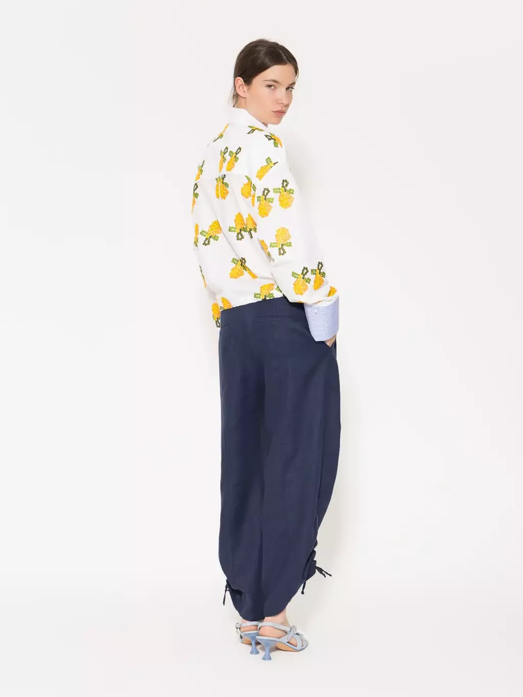 Pantalón Emma confeccionado en lino liviano. Presenta recortes en delantero y espalda, bolsillos escondidos al frente y bolsillos ojal en la parte posterior. Lleva jareta con lazo para ajustar y bordado marcario JCH en el delantero.
