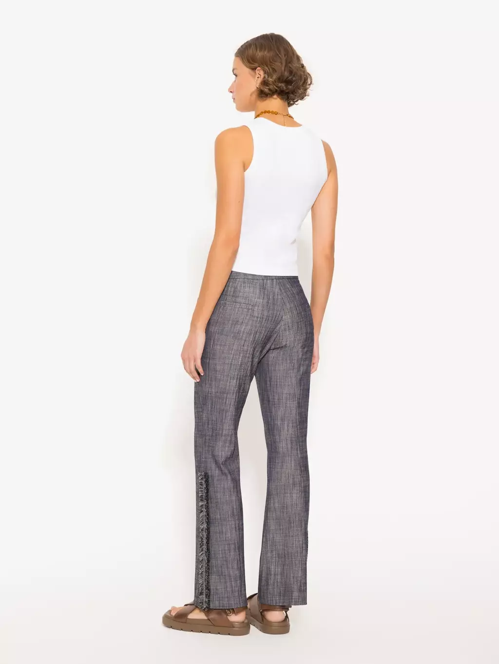 Pantalón Smith confeccionado en lino con look denim. De tiro bajo y fit recto, incorpora detalles de galón con flecos y cadenas en los laterales inferiores que aportan un aire sofisticado y moderno. Acceso mediante cierre metálico, gancho pantalonero y botón interno.