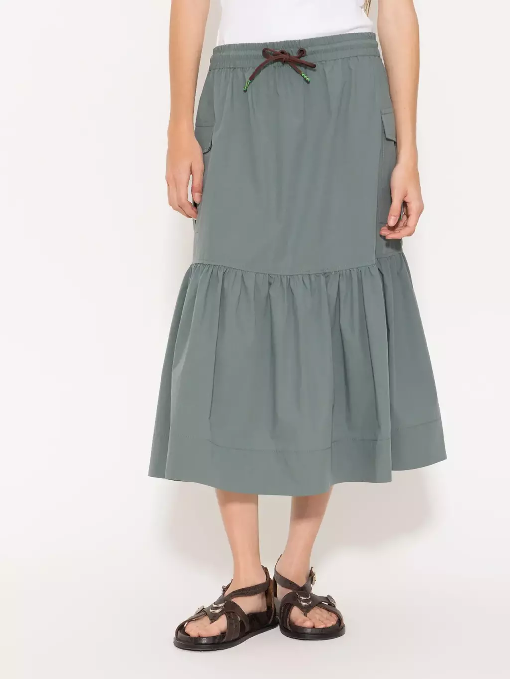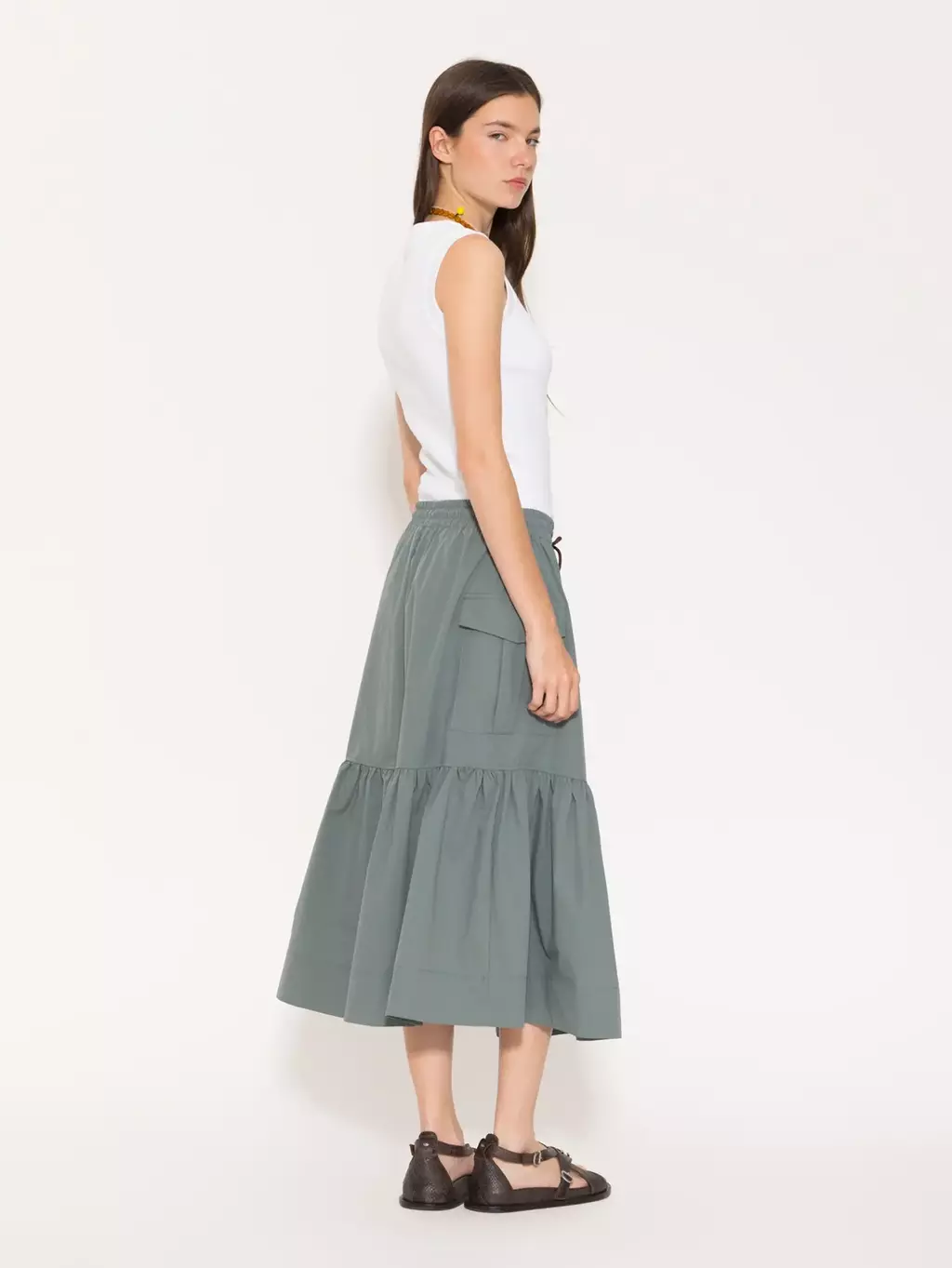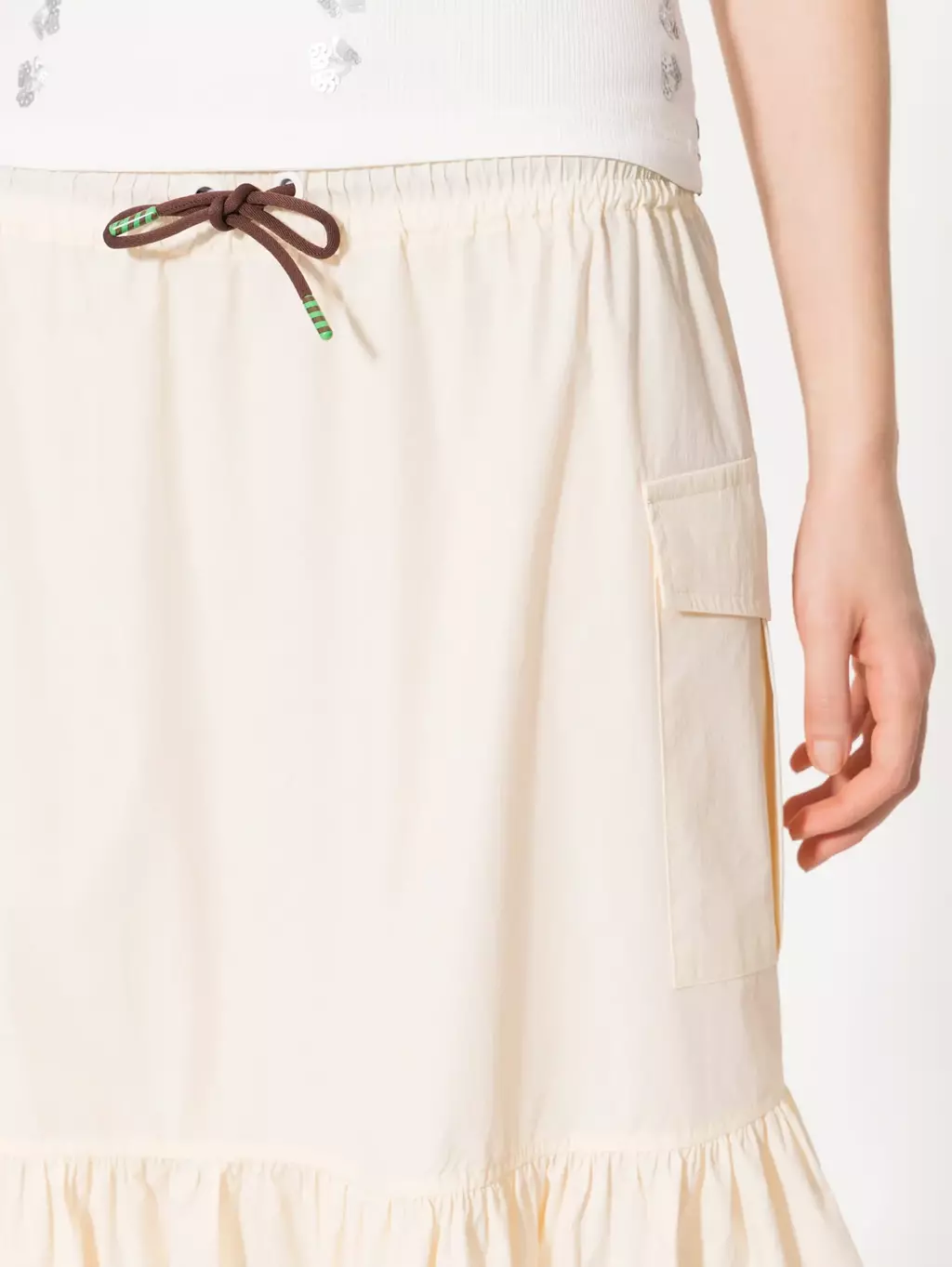 Pollera Julia de largo midi, está confeccionada en poplín liviano que aporta caída. Presenta cintura elastizada que garantiza un calce cómodo, acompañada de jareta con cordón y ojalillos esmaltados. Lleva bolsillos tipo plaque con fuelle y tapa; y un recorte con volado fruncido que le aporta mayor vuelo.