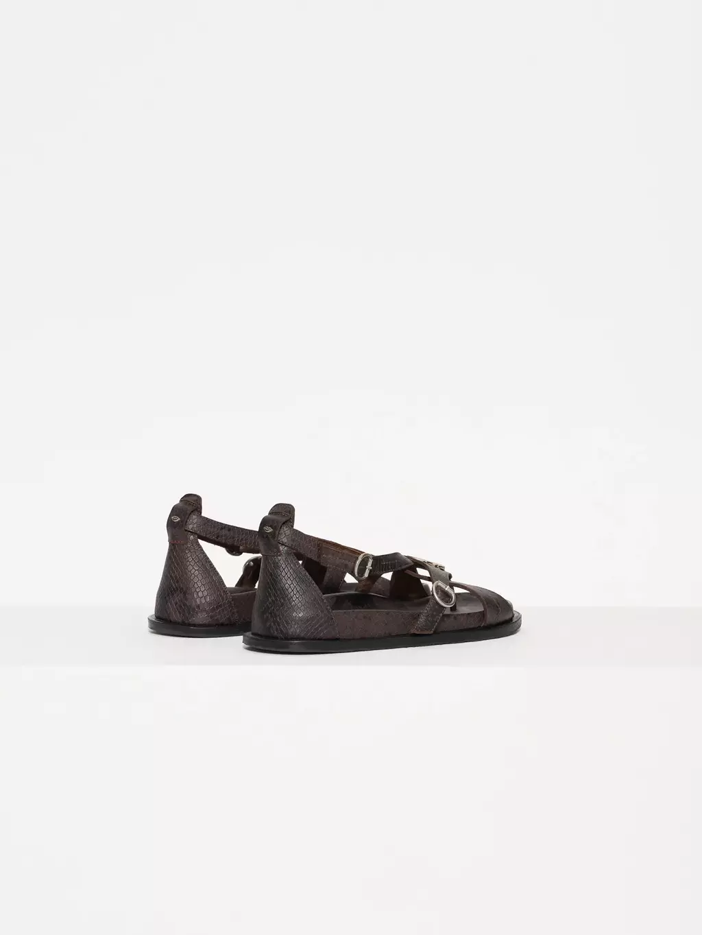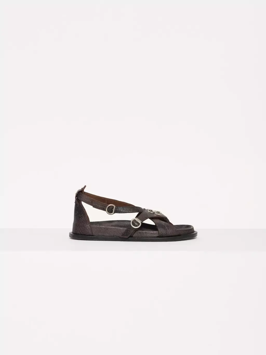 Sandalia Heart confeccionada en cuero vacuno texturado. Lleva doble hebilla lateral para mejor ajuste y aplique metálico en la capellada. Incluye detalle de mini lipstick en el talón. La plantilla es ergonómica.