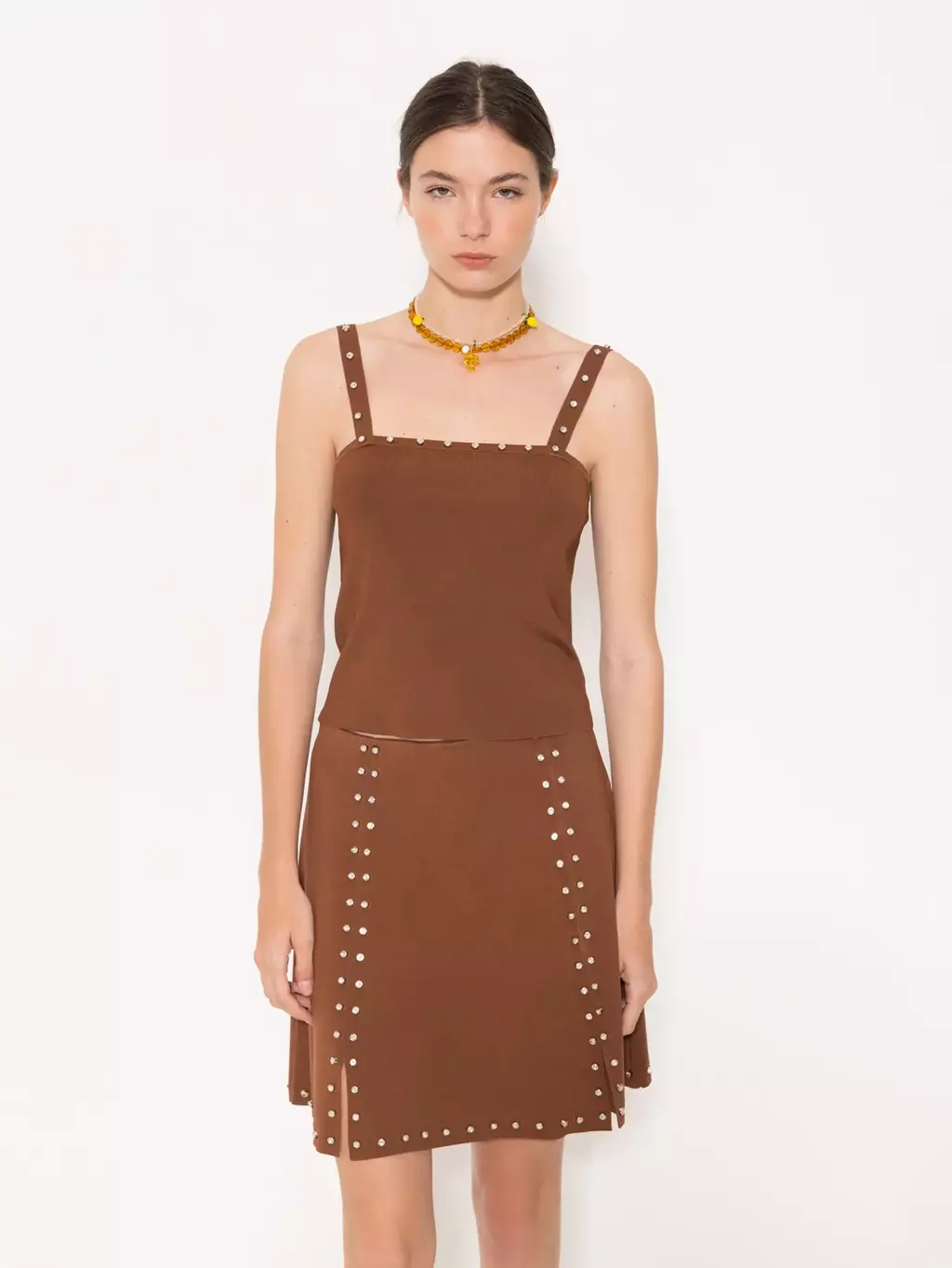 Top Jazz al cuerpo, largo hasta la primera cadera, con breteles y detalle de piedras en el escote que suman un toque sofisticado al diseño.