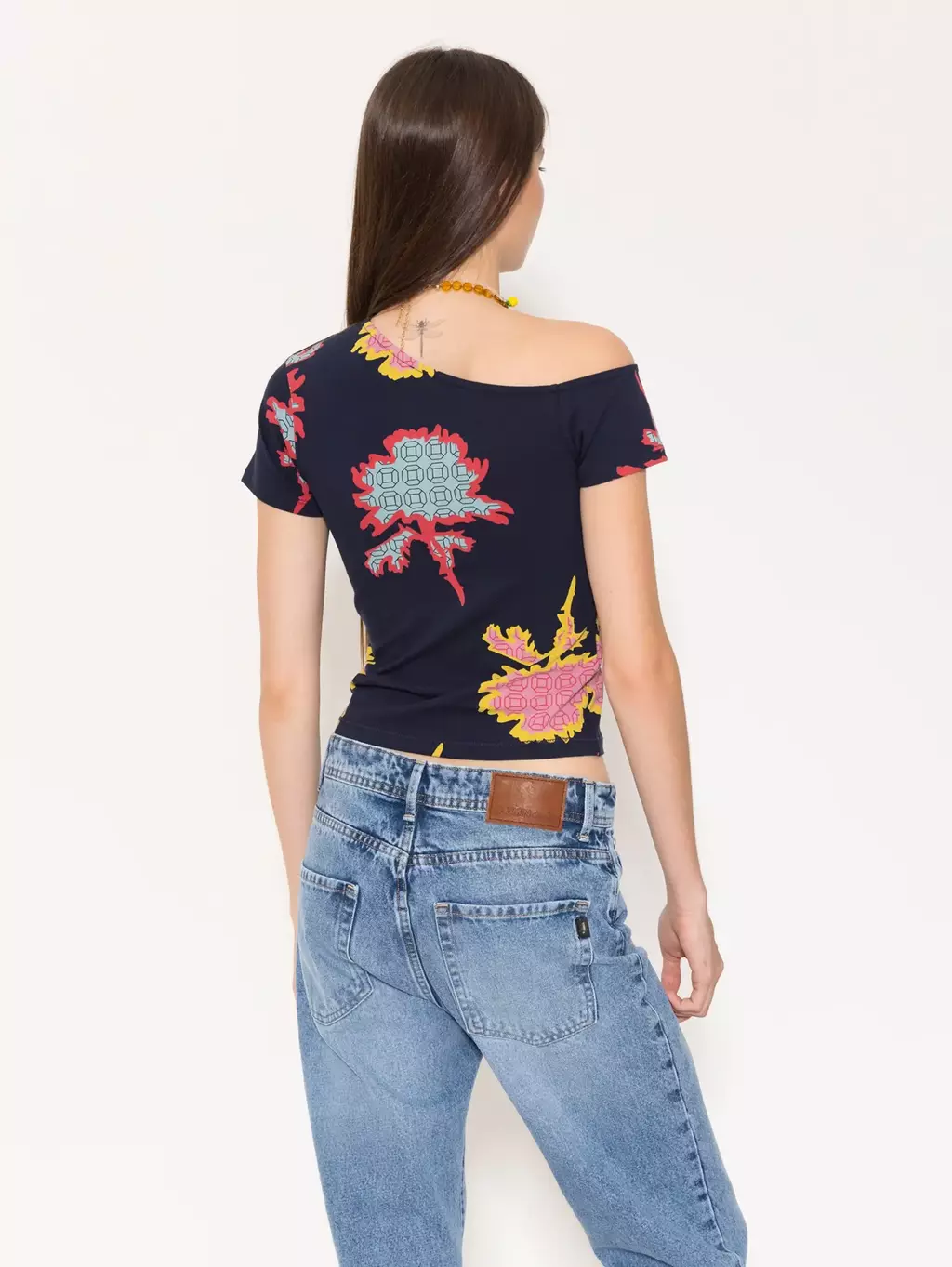 Top Rachel confeccionado en jersey estampado. Lleva escote irregular que cae sobre uno de los hombros, generando un efecto asimétrico. Con bordado JCH en el lateral inferior.