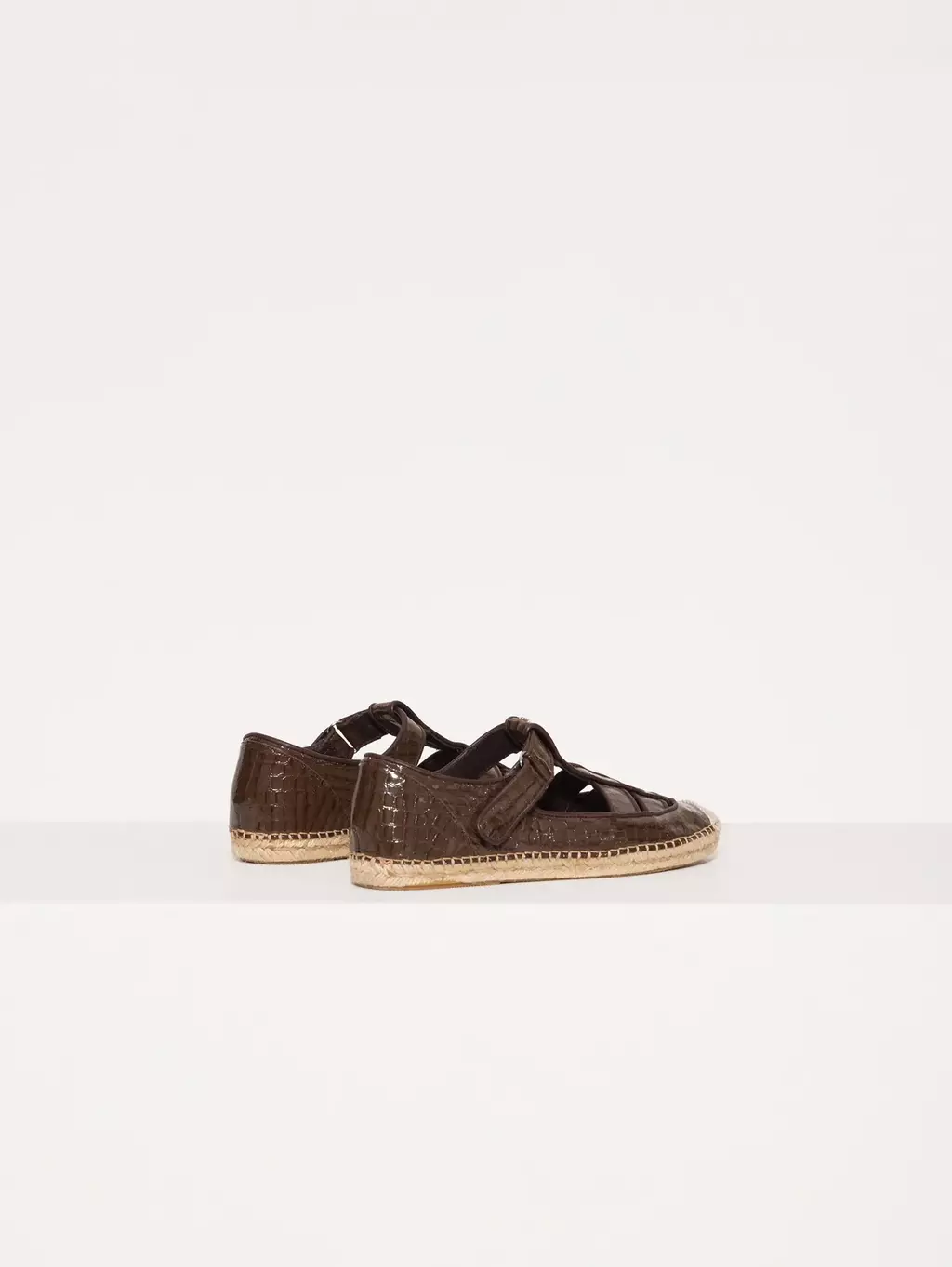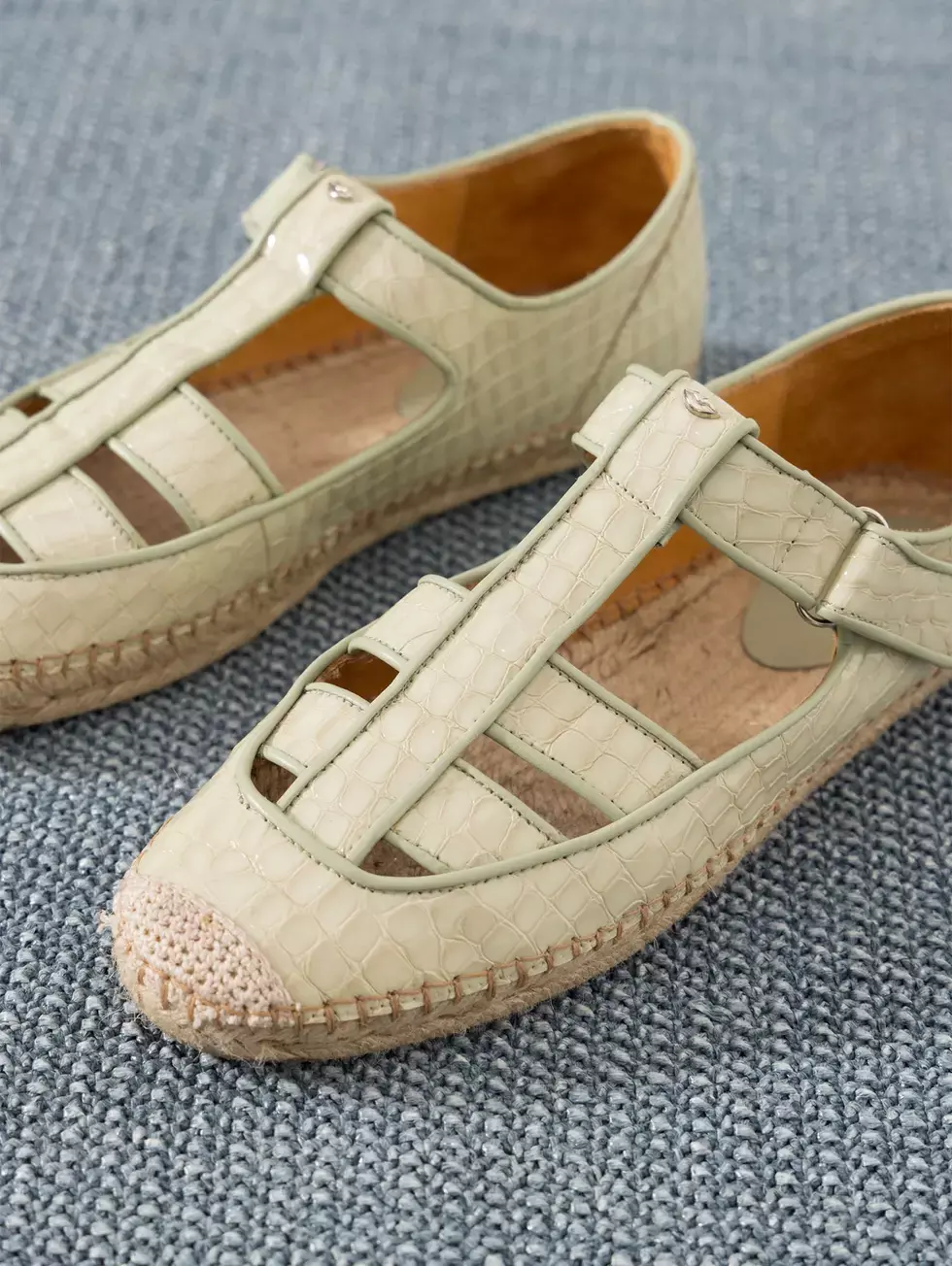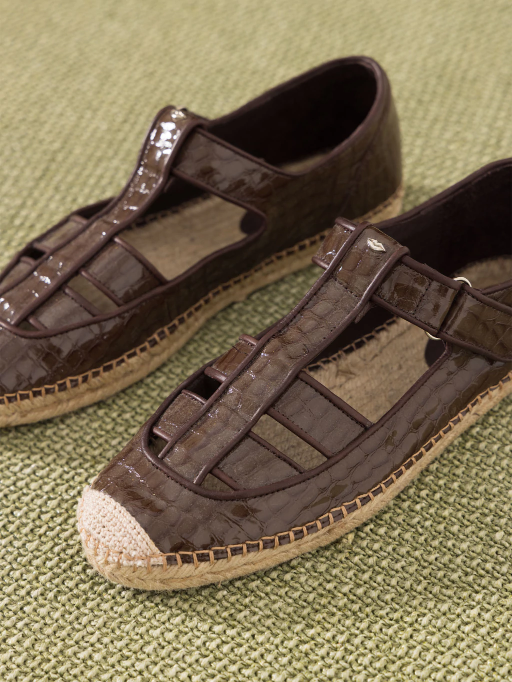 Zapato Francisca realizado en cuero croco combinado con cuero vacuno. Lleva base de yute, tira de velcro para mejor calce y detalle de aplique mini lipstick.