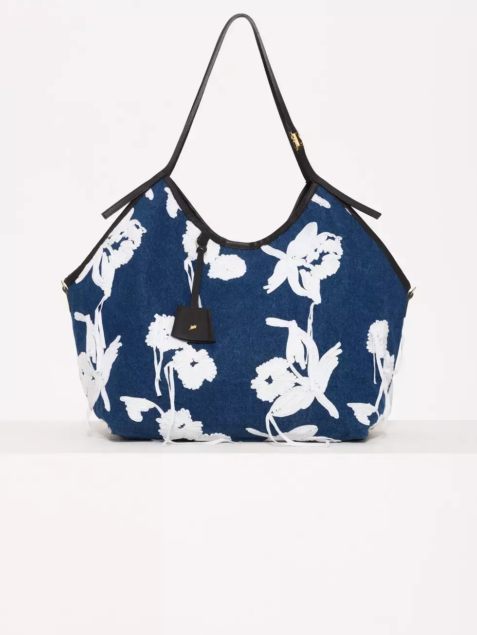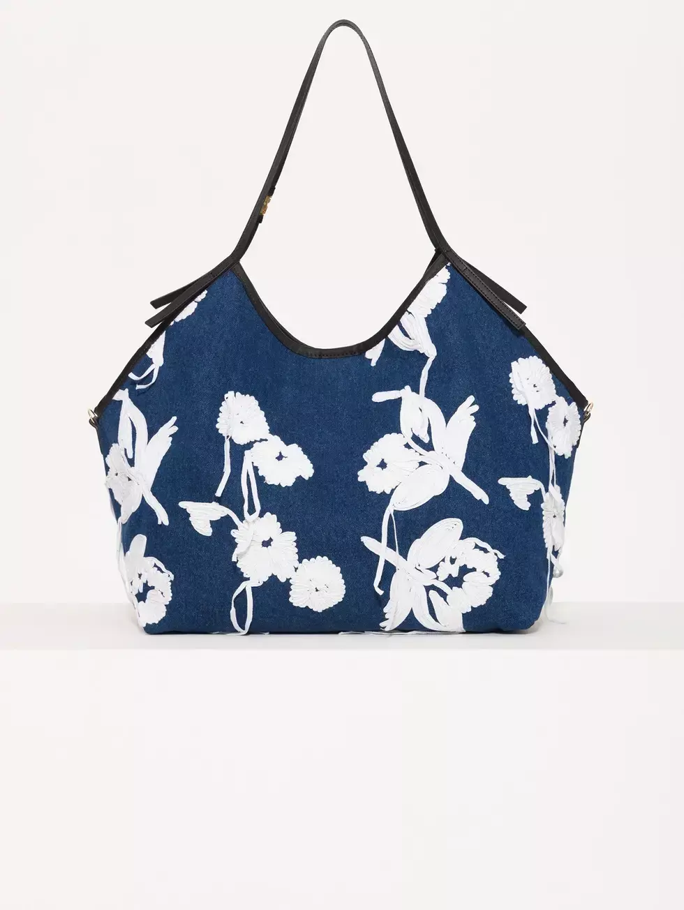 Bolso Oli Flowers confeccionado en denim bordado, con correas y detalles en cuero vacuno. Su interior está forrado e incluye un sobre desmontable para mayor organización. Se completa con apliques metálicos y hang tag colgante, un detalle sofisticado y distintivo. Amplio y práctico, pensado para acompañar con estilo.