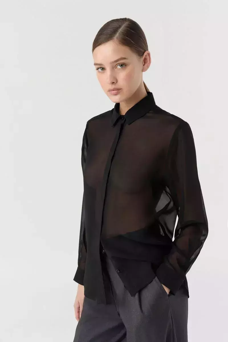 Camisa en seda natural; posee cartera con botones en delantero. Posee puños con botones. La ocasión de uso es nocturna debido a la materialidad de la prenda (seda natural), pero puede utilizarse de día en looks más formales.