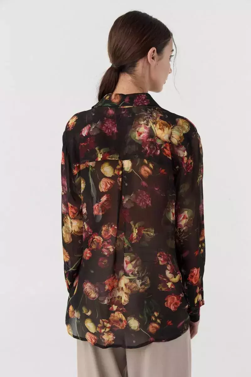 Camisa de gasa estampada con cartera con botones en frente y puños en manga. Posee translucencia, por lo que la ocasión de uso se piensa en la noche con un bustier por debajo o una musculosa negra. Ideal para combinar con pantalones de cuero para un look rockero.