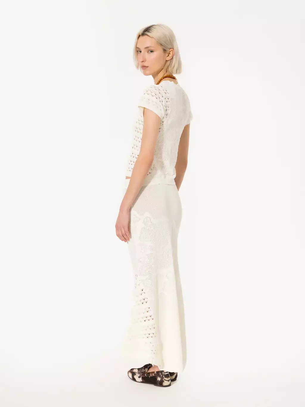 Pollera Cerise tejida en hilado frío con delicados puntos calados que aportan textura y sofisticación. De calce ajustado al cuerpo y largo por encima de los tobillos, es una prenda fresca y elegante, ideal para sumar estilo en días cálidos o looks de media estación.