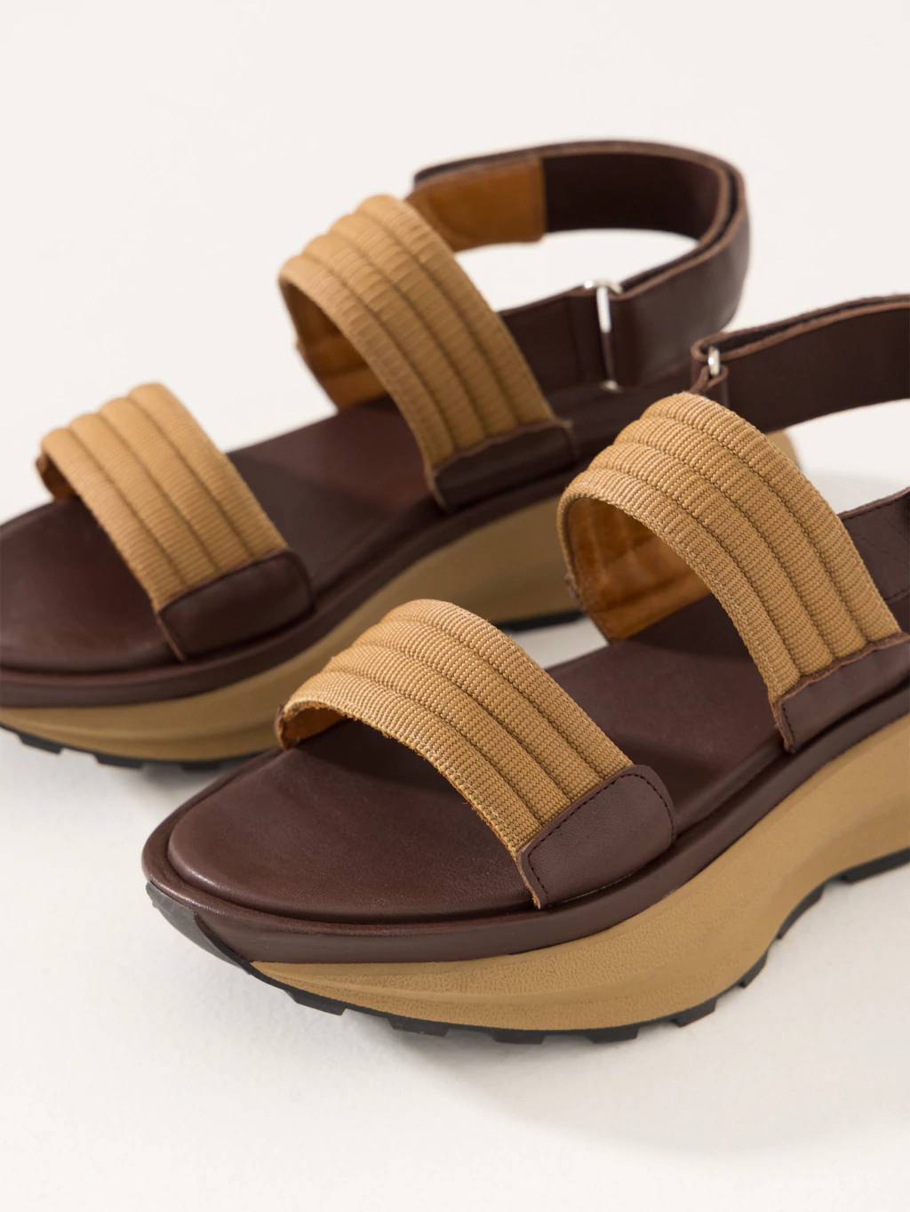 Sandalia Isla de taco alto, combinada en cinta acanalada y cuero vacuno. Lleva un delicado aplique mini Lipstick en el lateral, que la convierte en un diseño distintivo de la colección. Su acceso es práctico gracias a la tira de velcro que asegura el calce. Moderna y cómoda, perfecta para elevar cualquier look.