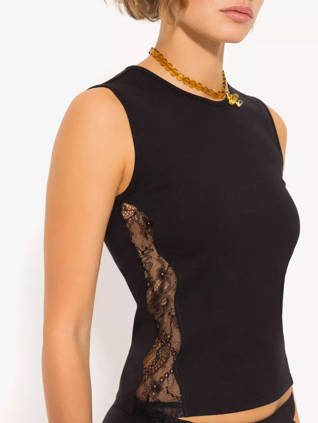 Top Amy confeccionado en punto con calce al cuerpo. Presenta recortes laterales en encaje. Es de cuello redondo y lleva el logo JCH bordado en el lateral.