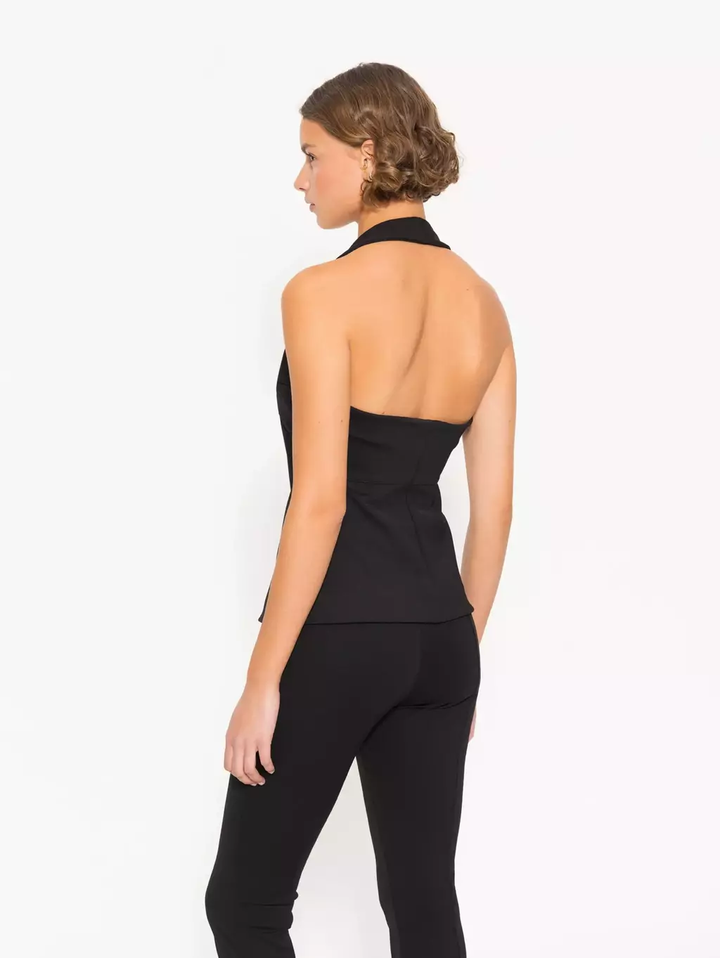 Top Lucy confeccionado en j-tecno, de diseño cruzado con cuello tipo halter que estiliza la silueta. El acceso es mediante broches moneda negros exclusivos JCH que le aportan un detalle distintivo. Una prenda actual y sofisticada, pensada para looks de noche con impronta moderna.