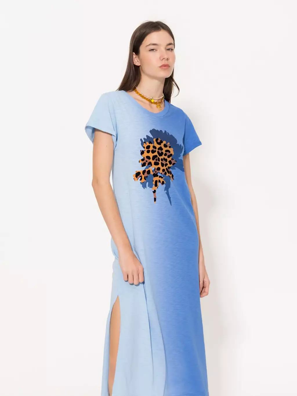 Tunica Paradise confeccionada en tela de punto de algodón pima, de calce relajado y largo por arriba del tobillo. Presenta manga corta, cuello redondo y tajos en los laterales que aportan movimiento. Lleva estampa en el frente y logo bordado en la espalda, combinando comodidad con estilo único.