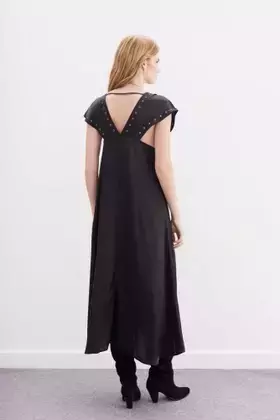 Vestido largo a los tobillos, de silueta fluida, confeccionado en viscosa con jacquard de corazones en el mismo tono. Escote en V y mangas cortas con detalle de tablas en el frente. Los ojalillos metálicos que recorren el escote y el ruedo de la manga suman un detalle de inspiración rocker a este vestido versátil y sentador.